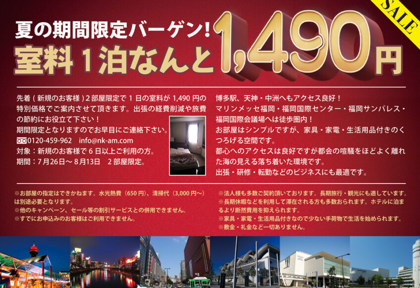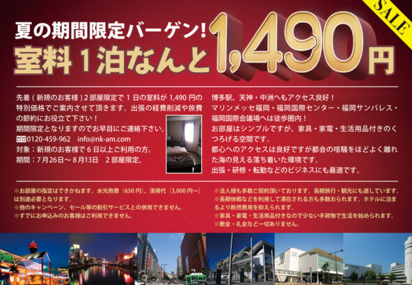 3ヶ月以上のご利用で、賃料がさらにお得になります。 福岡での長期滞在をお考えの方は、この機会にぜひご利用ください!
