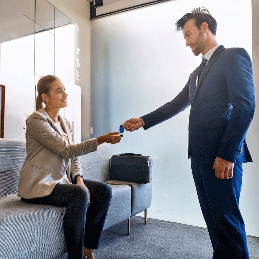 2. ご到着:ようこそお越しくださいました。まずは受付にてお名前をお伺いし、簡単な手続きをいたします。